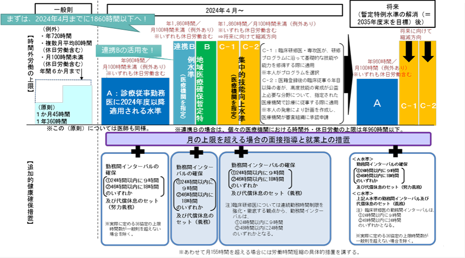 医師の働き方改革により時間外・休日労働時間の上限が設けられ、将来的にはB・C水準の医療機関で勤務するすべての医師の時間外・休日労働時間はA水準と同じ年間960時間以内に収めていく流れが進んでいきます。