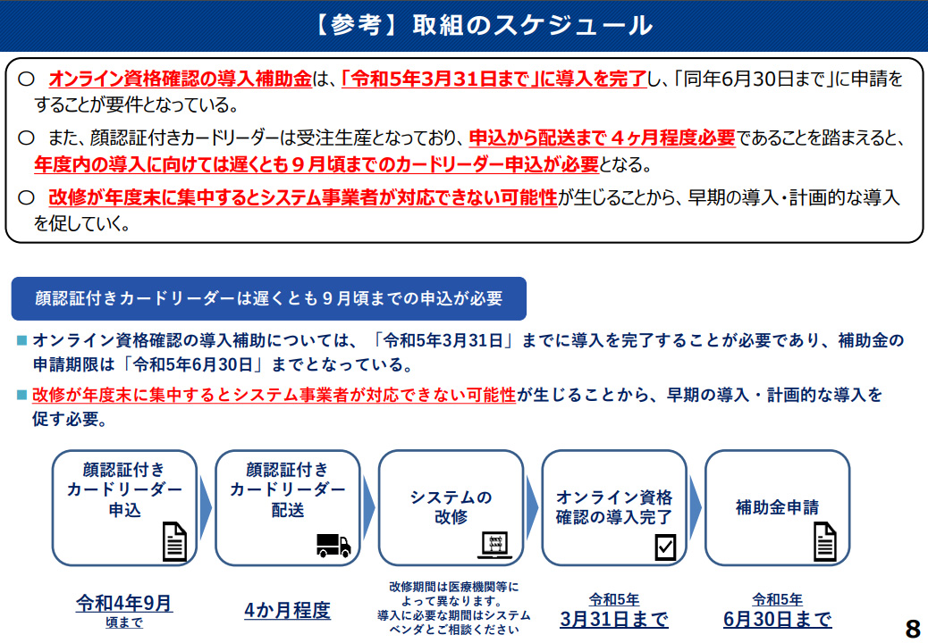生産や改修が集中してしまい、オンライン資格確認の導入が間に合わなくなる可能性等を考慮すると、早い段階から導入に向けて準備をするのがよいでしょう。