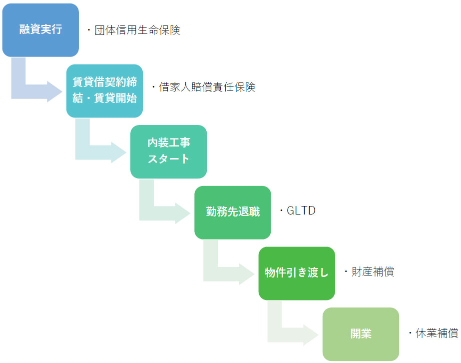 開業を準備していくなかで、コンセプト決めから場所探し、機器選定に融資、内装に採用から広告など多岐にわたりますが、上記のように外してはいけないタイミングで保険の検討と加入があります。