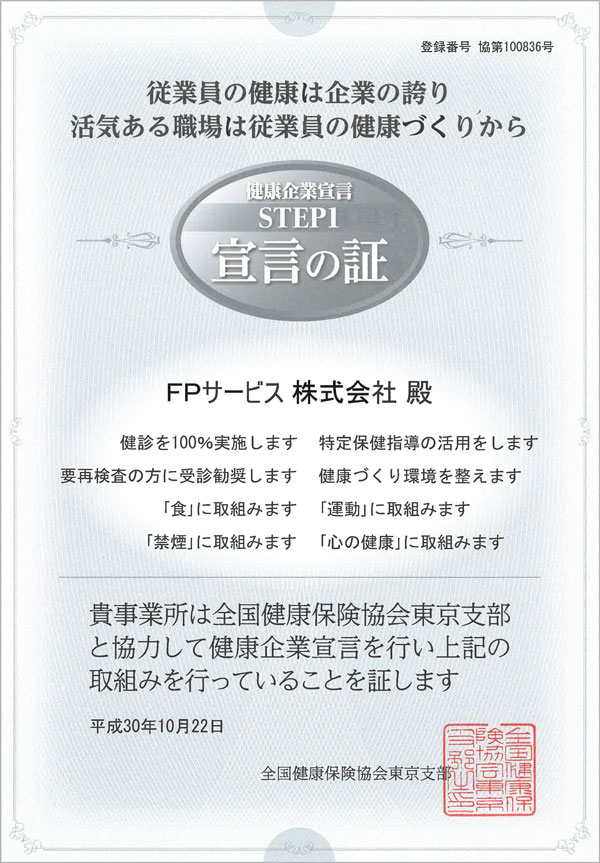 FPサービス株式会社は、自社の社員とそのご家族の健康の維持増進のため、健康に関する啓蒙活動や積極的な支援を行うことで「安心で心豊かな質の高い人生を実現する」という企業哲学の実現を目指します。